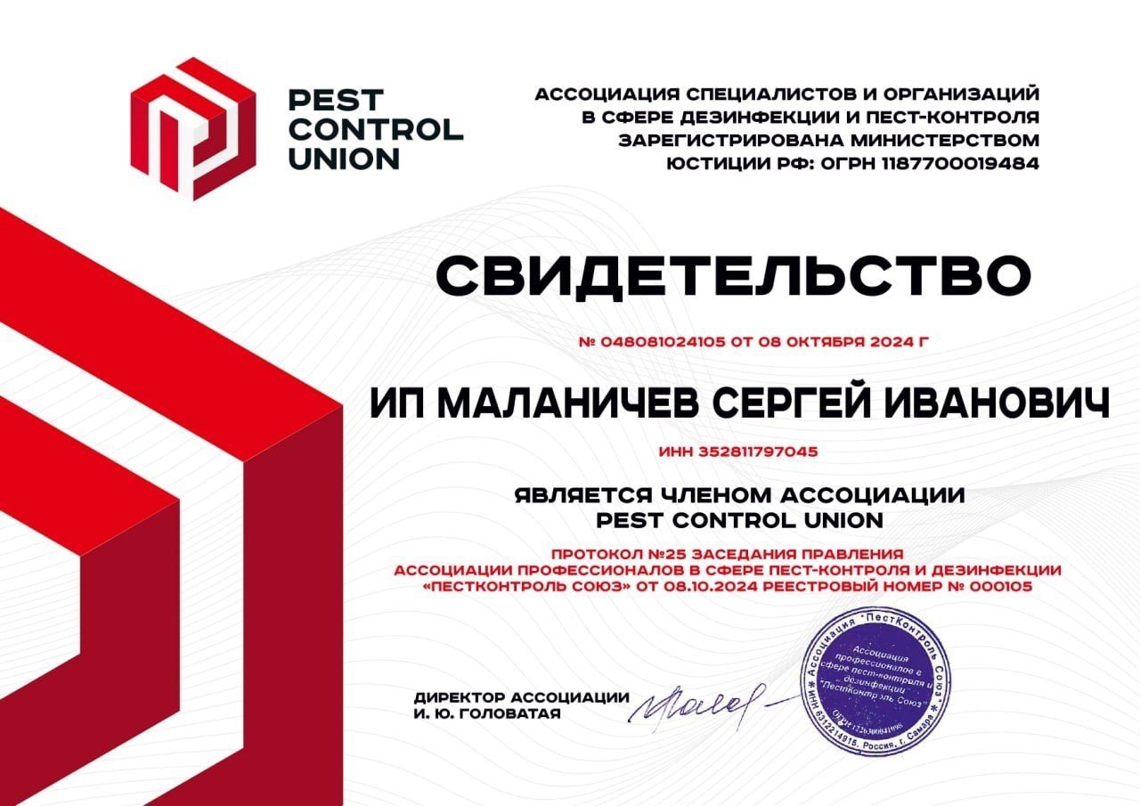 Мы продолжаем расти профессионально. В октябре 2024 года наша компания стала членом Ассоциации «ПестКонтроль Союз» — сообщества, объединяющего лучших специалистов в сфере дезинфекции.