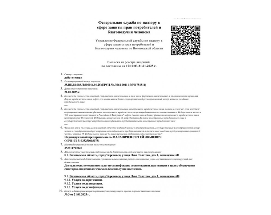 Наша компания имеет лицензию на услуги по дезинфекции, дезинсекции, дератизации.