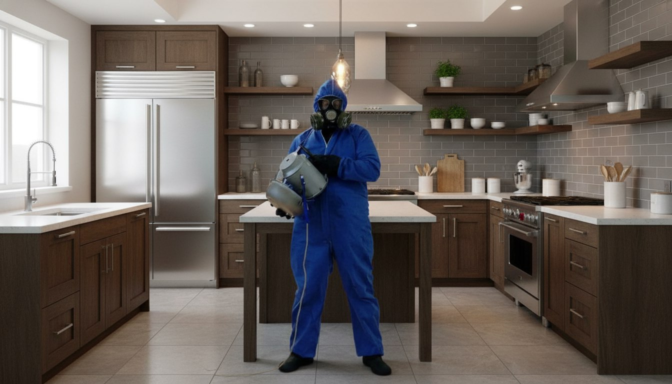 Для максимального эффекта нужно убрать продукты и средства гигиены в пакеты, накрыть аквариумы (отключив фильтр), убрать с пола мелкие предметы и по возможности отодвинуть мебель от стен на 10–15 см для доступа к плинтусам.